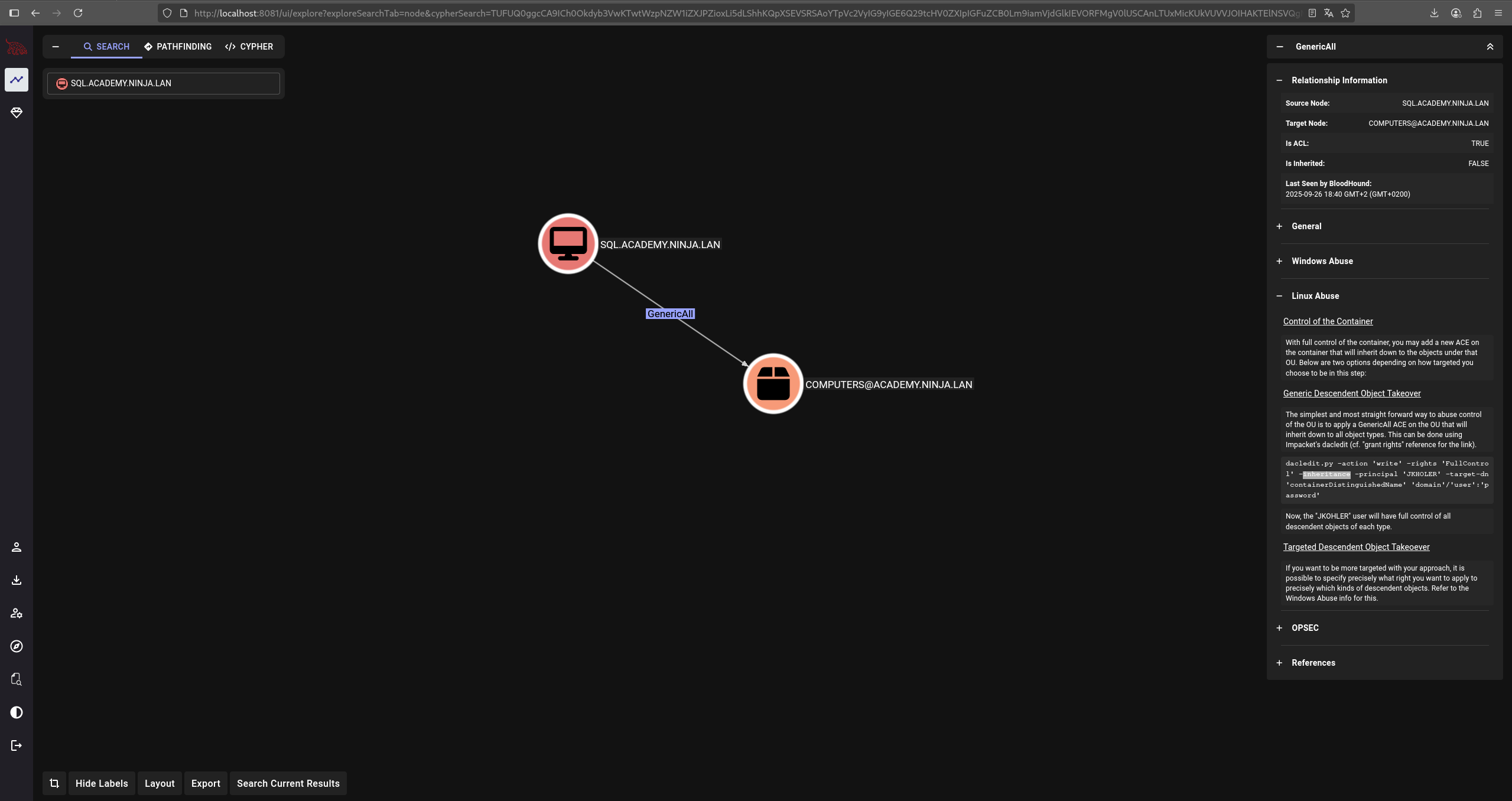 Si nos vamos a bloodhound y buscamos la cuenta de máquina sql, vemos que tiene GenericAll sobre un contenedor llamado computers, y bloodhound nos sugiere utilizar dacledit con el parámetro -inheritance, para que se hereden los permisos a todos los objetos que hayan dentro del contenedor.