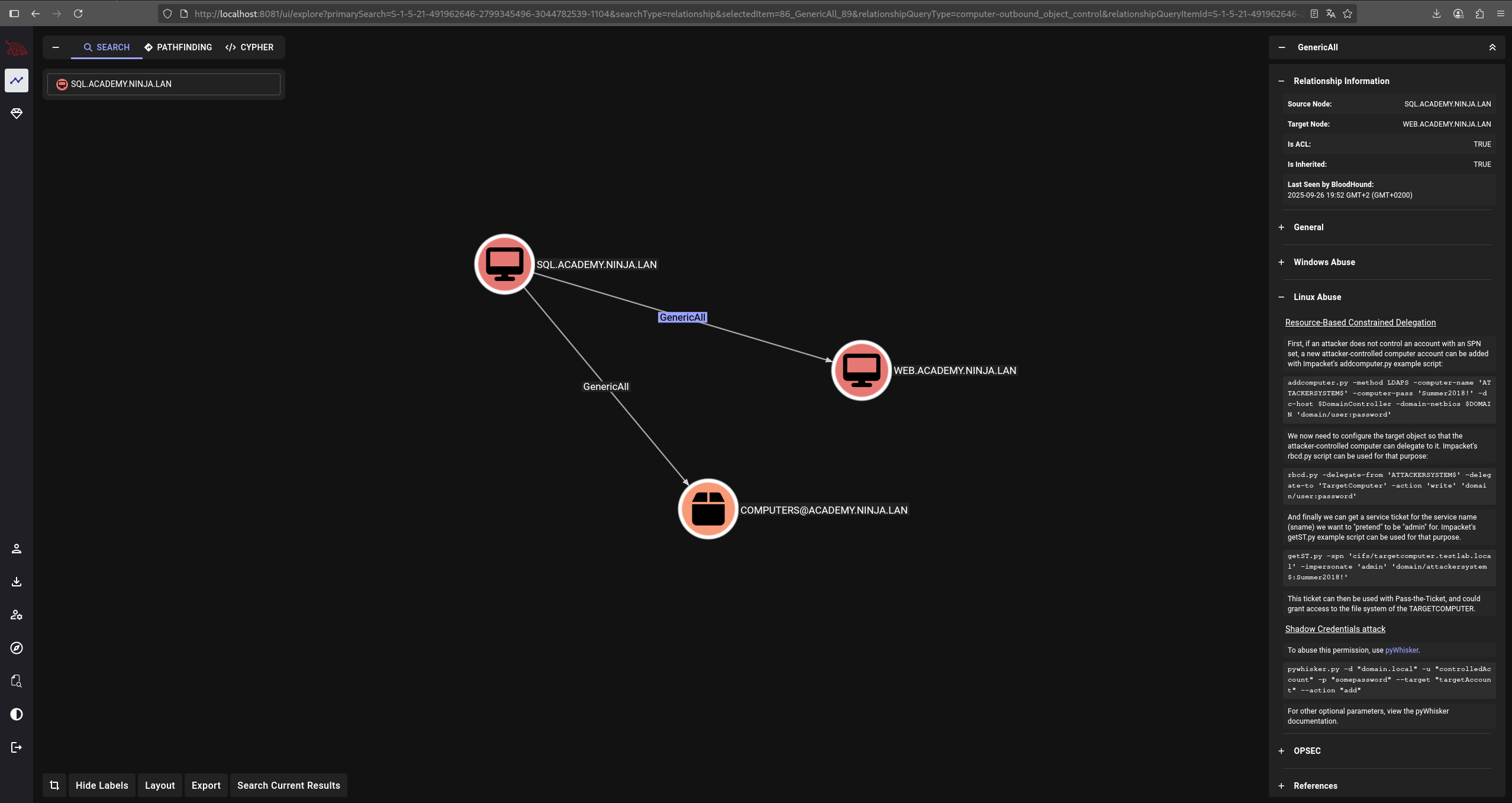 Ahora, si actualizamos la data de bloodhound, volviendo a ejecutar el comando de antes, descargando el nuevo archivo y subiéndolo a bloodhound vemos que tenemos GenericAll también sobre la máquina web$. Y además nos sugiere que utilicemos la técnica RBCD (Resource-Based Constrained Delegation).