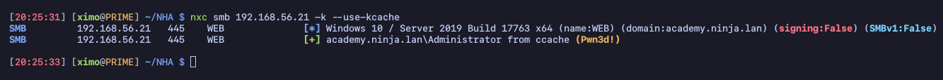 SMB 192.168.56.21 445 WEB [+] academy.ninja.lan\Administrator from ccache (Pwn3d!)