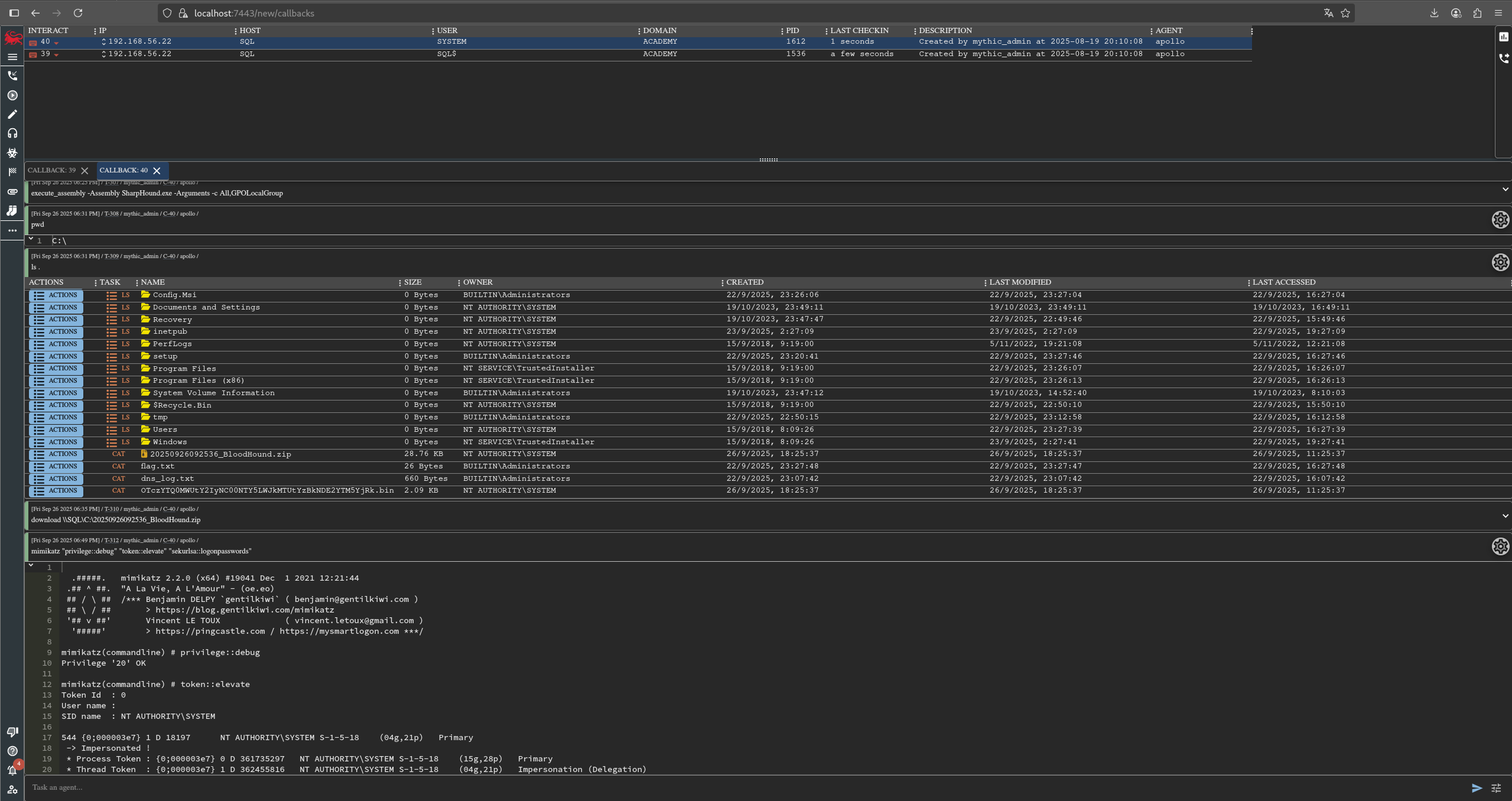 Además vamos también a ejecutar mimikatz desde mythic, para intentar obtener hashes que nos puedan servir para movernos lateralmente.